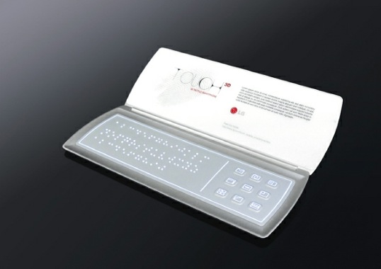 1、LG Touch:键盘按需凸起的触控手机亮点就在键盘上,LG Touch的键盘采用了一种高科技聚合物膜,这层膜可根据显示屏上的不同内容做出不同的触控反应,也就是说这是一个可进行3D变身的键盘,比如如果屏幕上显示的是一把电子吉他,键盘就会凸起变成一个吉他键盘;如果你正在购物,键盘就可以凸起,模仿当前衣服的布料纹路,让你切实感受布料的手感;如果使用者是盲人,那么这个键盘就会变成一个盲文键盘。 LG Touch概念手机在虚拟世界和现实世界之间大气另一座桥梁,让你以现实世界的体验去体会虚拟世界。