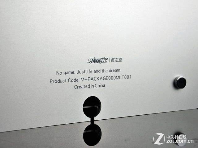 在背面板的底部,有主机编号以及名龙堂的Slogan 主机背部面板底部,我们可以看到名龙堂的Slogan,另外更有体现出真正定制主机的价值所在:那就是Product Code主机编号。我们手上的这款M-PACKAGE编号为000MLT001,是不是市售版的第一台呢,如果是的话还真的很有纪念意义:毕竟这是DIY整机厂商的首款自主研发设计的MOD主机,下方Created in China是不是也让玩家们有种归属感呢? 对了,上图中还有一个设计细节,那就是底部拥有一个圆形的28mm集线器开孔,让外观惊艳的主机用起来也很方便实用。