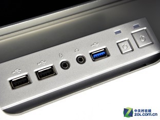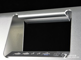 一般机箱的前置面板,放在了提手下方 之前草图中我们也提到了,为了让主机更加便于移动携带,机箱上方设计了专属把手:将一体铝制外壳的局部进行了压弯处理器,在没有破坏整体观感的同时,提手的握持舒适性也考虑的进去。 机箱前面板的接口在提手下方,同样是在主机的正反面并不会有突兀感,但可以看到:开机、重启、USB3.0、USB2.0、耳机麦克接口一个都不少。