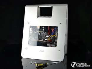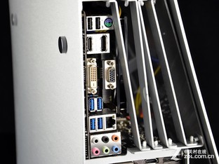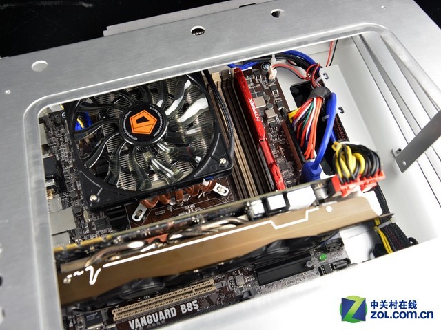 主机内部硬件堪称性能级 为了照顾到主机的MOD外形,我们可以看到主机的内部空间相比一般的塔式机箱要小一些,是基于mATX紧凑型主板设计的。不过诚然如此,散热器部分也采用了下压式风扇,但风扇面积足够大,不超频足以还能带来静音的效果。