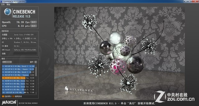 CINEBENCH测试成绩:OpenGL 76.39帧/CPU 8.33分(点击可看大图) 本次的测试主机运行Super Pi 1M的时间仅为9.328秒,CINEBENCH测试部分,主机OpenGL的得分为76.39fps,CPU性能得分为8.33pts。CPU单核性能一直是Intel平台处理器的强项,所以我们看到了Super Pi跑出的高成绩:22nm 3D晶体管的技术,一直在桌面处理器芯片界领先。而M-PACKAGE的CPU处理器还采用了最新Haswell Refresh平台的非超频旗舰酷睿i7-4790,相比i7-4770K在不超频的情况下,其性能甚至还有一定优势。Cinebench部分,其中有对平台图形性能的测试,而主机标配的GTX770,OpenGL测试平均帧也达到了76.39,完全达到了流畅的程度,后面还会有针对性的图形测试,一会我们来看。