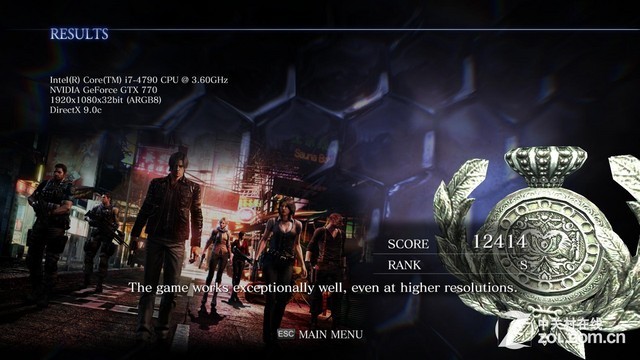 最终升级为12414,评定等级为S 《生化危机6》的游戏测试部分,我们采用了1080P分辨率,最高特效,同时使用游戏中自带的Benchmark功能进行测试,改作相比《生化危机5》画面素质有了较大提升,Capcom研发的最新引擎带来的物理特效要有很大提升,所以对于显卡的考验还是很大的。不过在本次的测试平台中依然达到了极为优秀的运行状态。最后的测试结果为12414分,性能评定等级为S(最高等级)。